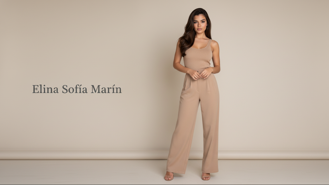 Elina Marín is an AI-created fashion character inspired by soft glam, quiet luxury, and modern femininity.