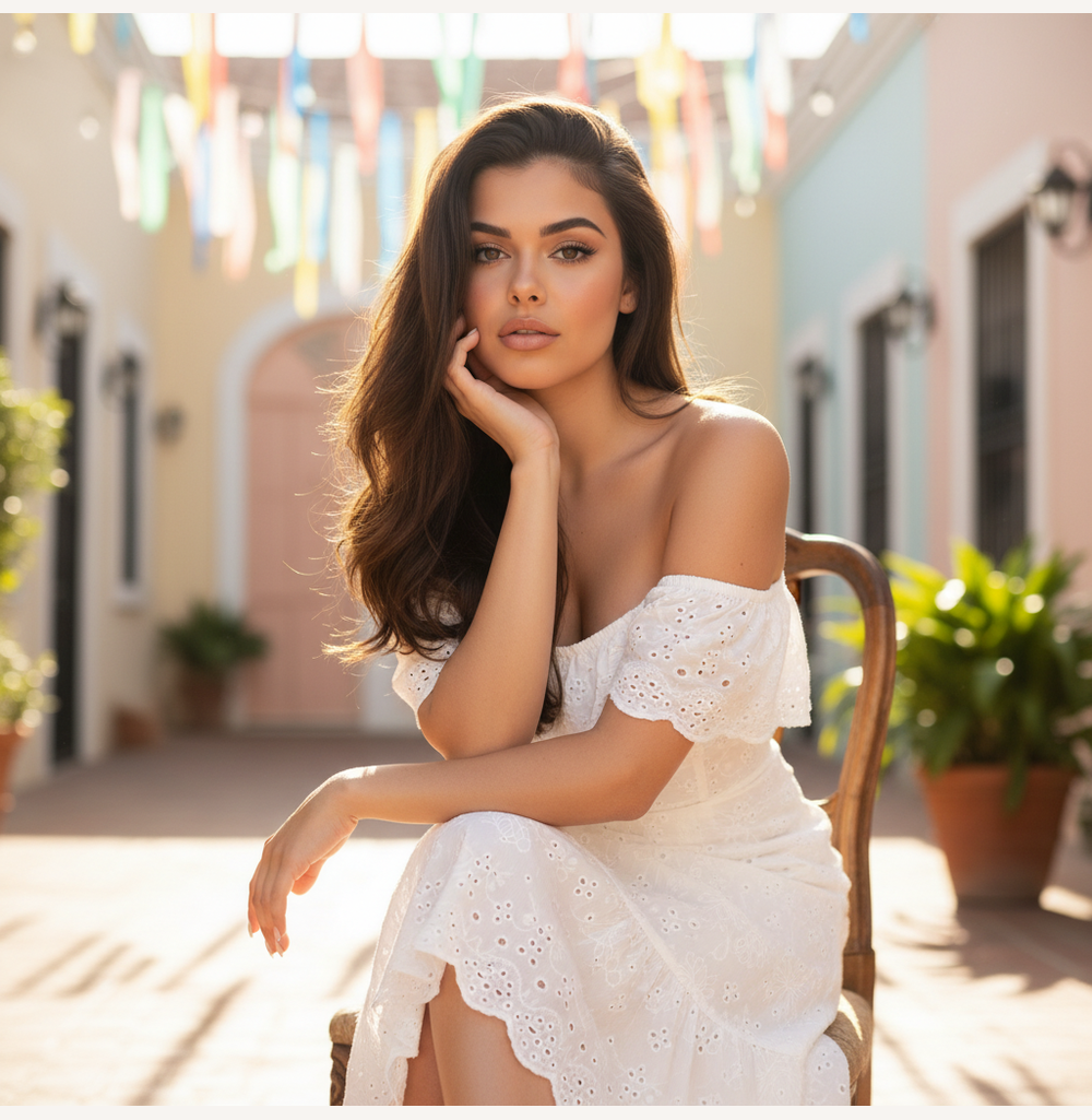 Fashion influencer Elina Marín standing on a sunlit porch in a pastel-colored courtyard, wearing a white eyelet off-shoulder midi dress, one hand gently in her hair and a soft relaxed smile, long dark hair in loose waves, warm golden-hour light, soft background of greenery and pastel walls, quiet luxury travel fashion vibe, high-resolution lifestyle photo, horizontal composition with plenty of space around her.